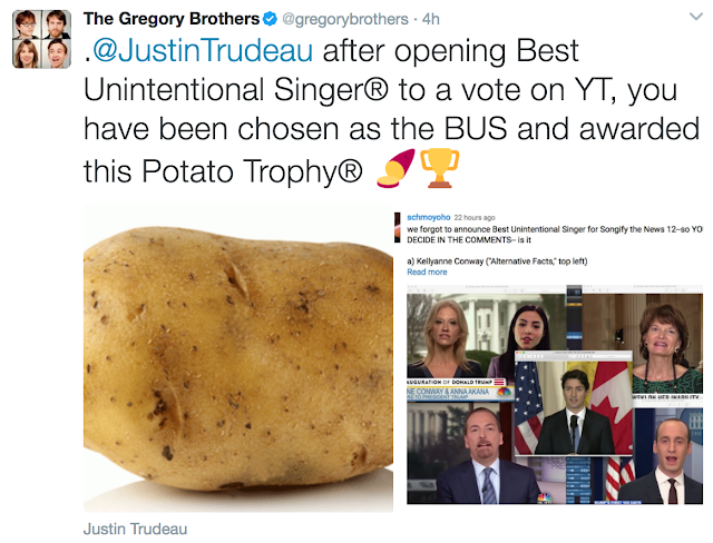 Your votes were counted, and TRUDEAU WON HANDILY-- so to fulfill our end of the bargain, we tweeted his Potato Trophy at him and he can treasure the prize and all the glory that comes with it for a lifetime👌