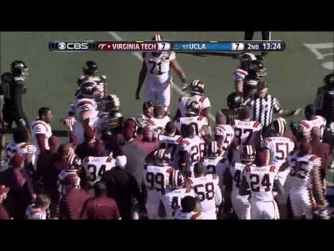 (apologies for the bad aliasing in the video) Virginia Tech quarterback Logan Thomas lights up UCLA linebacker Myles Jack in the 2013 Sun Bowl. For great coverage of Virginia Tech football, visit TechSideline.com