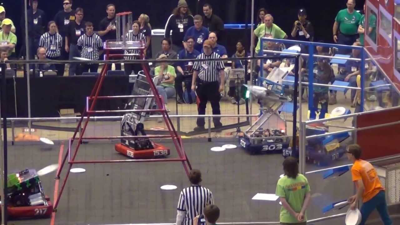Score: Red 140 points; Blue 184 points. Alliance #1 RED Teams (drivers on left) frc team 1538, 1986, 217 vs. Alliance #3 BLUE Teams (on right) frc team, 303, 3476, 1640. FIRST Robotics 2013 Ultimate Ascent CMP Championship Newton Division Elimination Tournament Match.