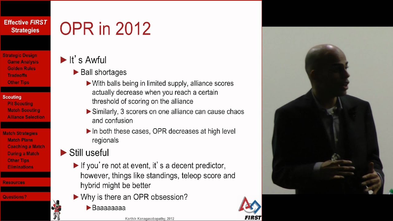 This presentation focuses on three major areas, Strategic Design, Match Planning/Execution, and Scouting. Rather than spending time on equations and detailed calculations, the Strategic Design gives a more high-level overview of how to design an FRC robot. This portion of the presentation includes sections on such often neglected strategic design areas such as Game Analysis, Chokehold Strategies, Cost-Benefit Analysis, Task Prioritization, and Tradeoffs using a case studies from past games. The Match Planning/Execution section of the presentation discusses effective habits and strategies that will help lead a team to victory. This is a must for those who enjoy the strategic aspects of FIRST. The Scouting section deals with effective techniques to collect information on your partners/opponents, and how to make the most of this data. Advanced statistical metrics analgous to "Sabremetrics" in baseball will also be discussed. The presentation is filled with entertaining and insightful historical FIRST anecdotes from the past 14 years. With the information in this presentation, you can turn your team from a mere competitor to a perennial powerhouse!