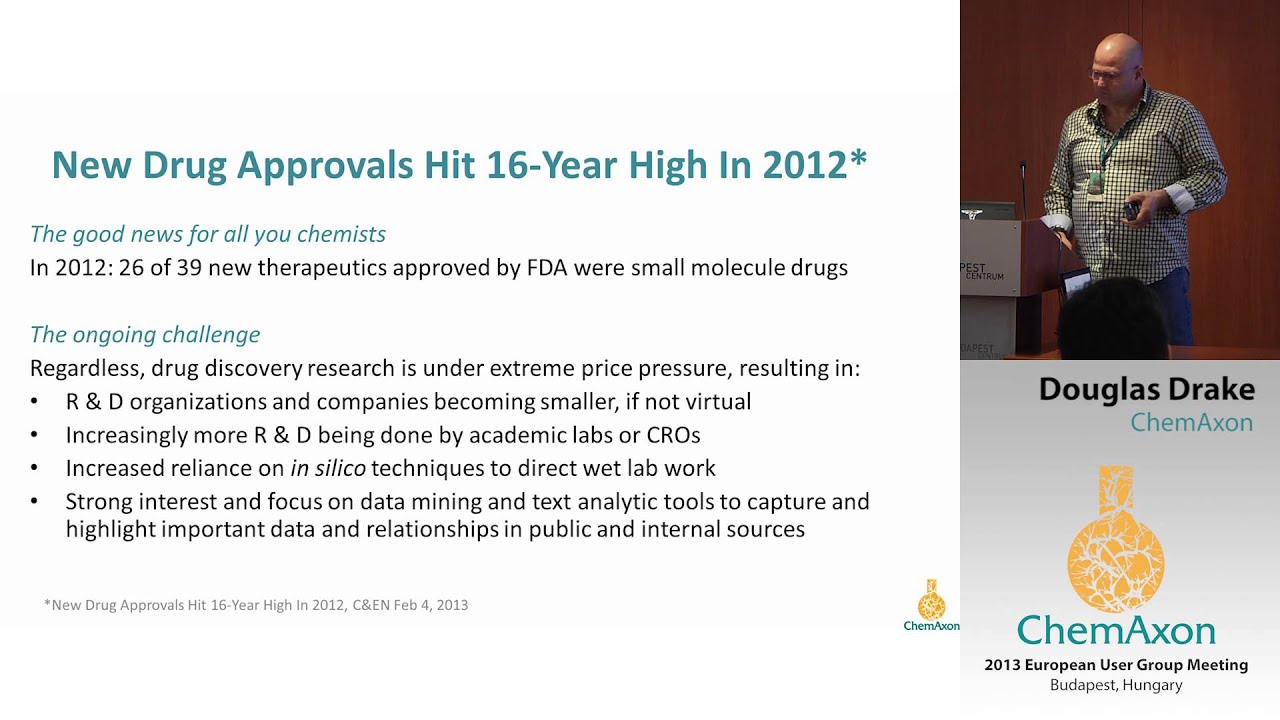 In 2012, 26 of the 39 new therapeutic products approved by the FDA, two thirds of the total, were small molecule drugs indicating that medicinal chemistry is still the forefront of drug discovery R&D. Despite this, drug discovery chemistry is a multi-tiered problem: from identifying a therapeutic MOA, to making unique and defensible chemistry, to SAR and pharmacophore modeling, to understanding pharmacokinetic properties, bioavailability and safety. Each aspect builds on the rest because it is not just about making a unique and therapeutically active compound; it is also about being able to deliver it effectively and safely within patients. The following presentations highlight various aspects of how ChemAxon's products and tools can be used in drug discovery chemistry; from reaction mapping, property calculation, structure filtering and virtual screening to metabolite prediction, chemistry text analytics and knowledge management and as well as our recent advances in biomolecular structure management.