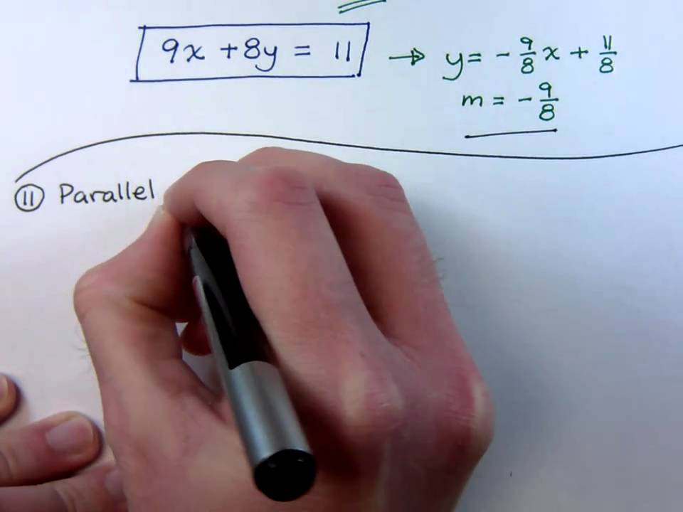 Write the equation for the line perpendicular to 8x - 9y = 3 and passing through (-5, 7).