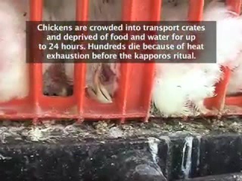 Every year, devout Jews around the world engage in an age-old ritual called kapparot, in which an individual swings a chicken over his head imbuing it with his sins. The chicken is then slaughtered and its meat donated to a local food charity. In this video, the animal rights activist group PETA documents abuses inconsistent with Jewish ethical laws in an attempt to convince the Jewish public that the ritual should no longer be practiced -- especially considering that Jewish law permits that money be used (and donated) as a substitute for a live animal.