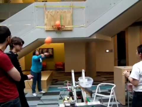 F.I.R.S.T. FRC Robot competition for 2012 - Team 488's (Xbot) prototype shooter from 18'. Only air pressure control so far but repeatable.