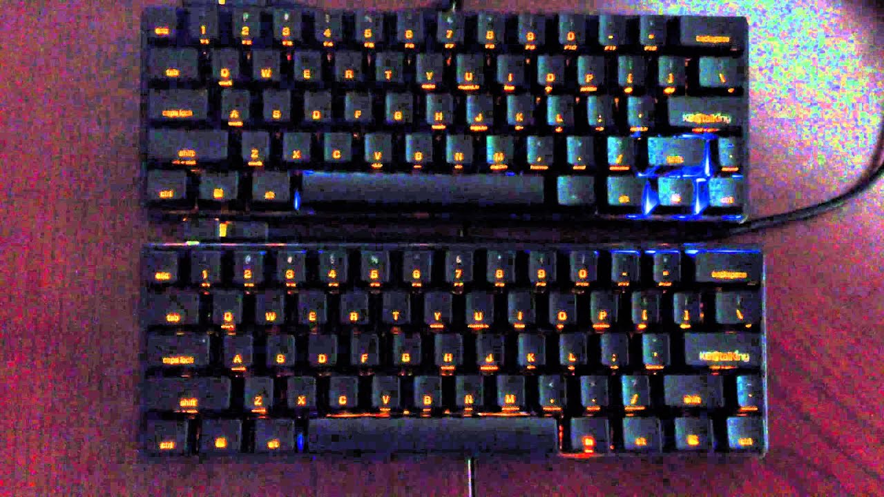Two KBT Pure keyboards with LEDs pusling on and off in "Breathing" mode.