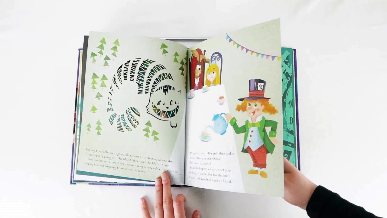 Seguendo un coniglio bianco, Alice giunge in un mondo fantastico popolato da personaggi bizzarri e strampalati… tra carte da gioco, gatti evanescenti e feste di non compleanno, riuscirà a ritrovare la strada di casa? Sfoglia le pagine finemente traforate e segui la piccola protagonista nel suo viaggio nel Paese delle meraviglie.