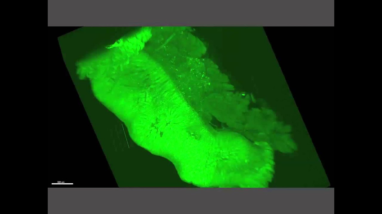 Rgs16::GFP;KIC mouse (P42) with a PDA tumor in the head of the pancreas. Light sheet microscopy was used to capture planar images of the duodenum and pancreas head. A computer generated 3D rotational movie shows Rgs16::GFP expression in a PDA tumor, several small areas of neoplasia and normal acinar cells in lobes of the exocrine pancreas. Rgs16::GFP is expressed in presumed neuroendocrine cells within villi of the duodenum. The original research can be accessed at http://dmm.biologists.org/content/8/1...