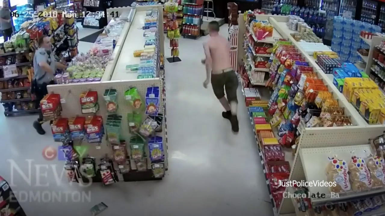 Surveillance video shows an Edmonton woman attempting to evade police in a Spruce Grove convenience store, by trying to climb into the ceiling panels, eventually crashing back into the store.