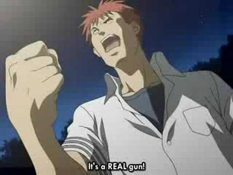 Another funny part of Full Metal Panic Fumoffu. Where a street gang does a little "briefing" on the gun Sagara used to knock them down.I do not own Full Metal Panic Fomoffu.All rights go to the respective owner.