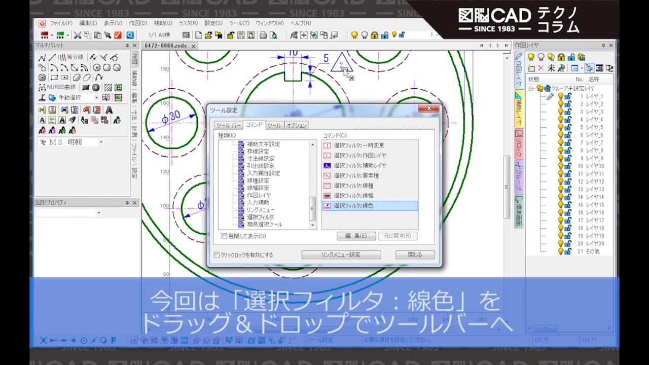 ★☆操作の詳細を知りたい方は 『図脳クラブ』へ!☆★『図脳クラブ』内コンテンツ「How to 図脳CAD」にて多くの動画を公開中!【図脳クラブ】http://caduser.photron.co.jp/図脳CADシリーズ(2次元CAD、3次元CAD)のユーザー様を対象に、会員専用Webサイト『図脳クラブ』を開設しています。ユーザー登録をされた方ならどなたでも入会無料!図脳クラブにログイン後、[サポート]-[How to 図脳CAD]にて図脳CADの便利機能についての動画を公開中です。図脳クラブを有効活用し、より快適に図脳CADを使いこなしましょう!━━━━━━━━━━━━━━━━━━━━━━━━━━━━━━━━━━━「選択設定」コマンドは、図面内の文字だけを選択したい時や、線分だけを選択したい時に、その要素だけを指定して選択できる機能になります。※ 「選択設定」コマンドの説明動画は…http://www.photron.co.jp/products/cad...図脳RAPIDPRO18なら、ツールバーへアイコンとして配置ができるため、より便利に活用いただけます!ツールバーへの配置手順は以下の通りです。1.[ツール]-[ツール設定]をクリックします。2.[コマンド]タブをクリックします。3.種類より[その他]をダブルクリックし、一覧から[選択フィルタ]をクリックします。4.[コマンド]より、使用するアイコンをドラッグ&ドロップでツールバー上に配置します。ツールバーのアイコンから素早く「選択設定」を起動することができるため、さらに作図作業の効率アップにつながります。●対象ソフトウェア図脳RAPIDPRO18(http://www.photron.co.jp/rapidpro18/)