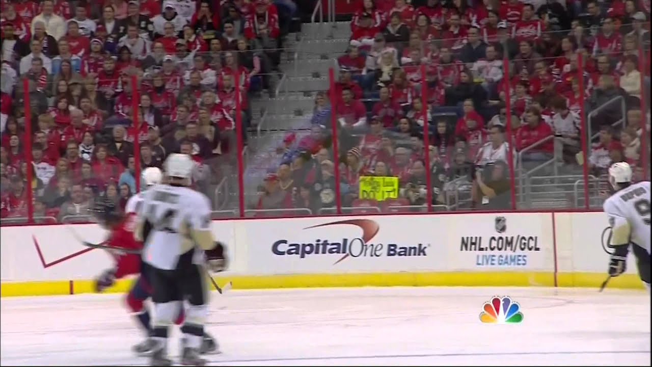John Carlson crazy bounce goal 3 Feb 2013 Pittsburgh Penguins vs Washington Capitals NHL Hockey. Dumped in puck hits stanchion on glass and careens into net as Vokoun trips behind the net.